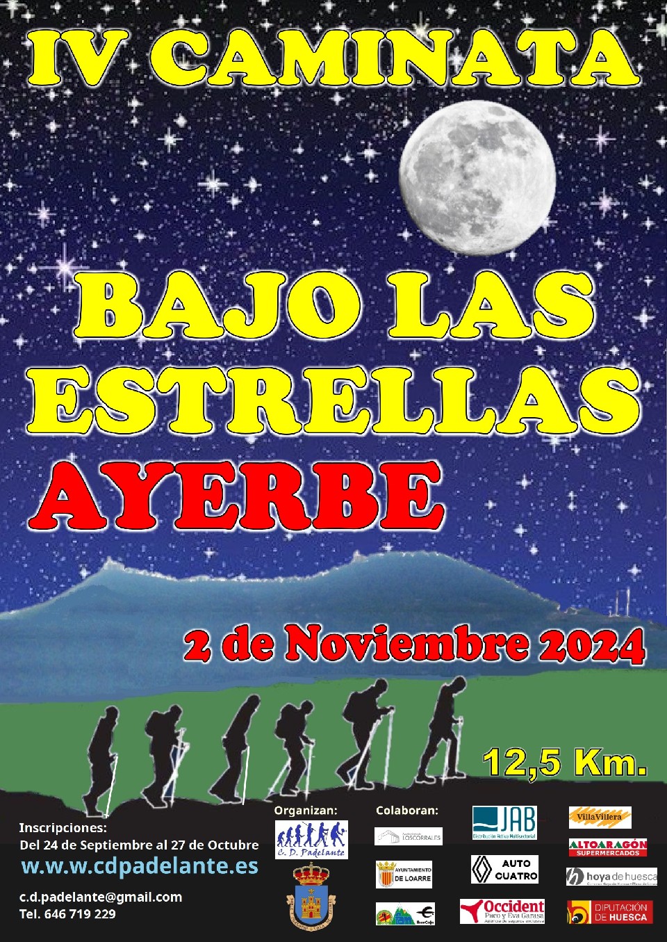 El Club Deportivo Padelante y el Ayuntamiento de Ayerbe organizan la IV Caminata Nocturna BAJO LAS ESTRELLAS el próximo 2 de noviembre de 2024.