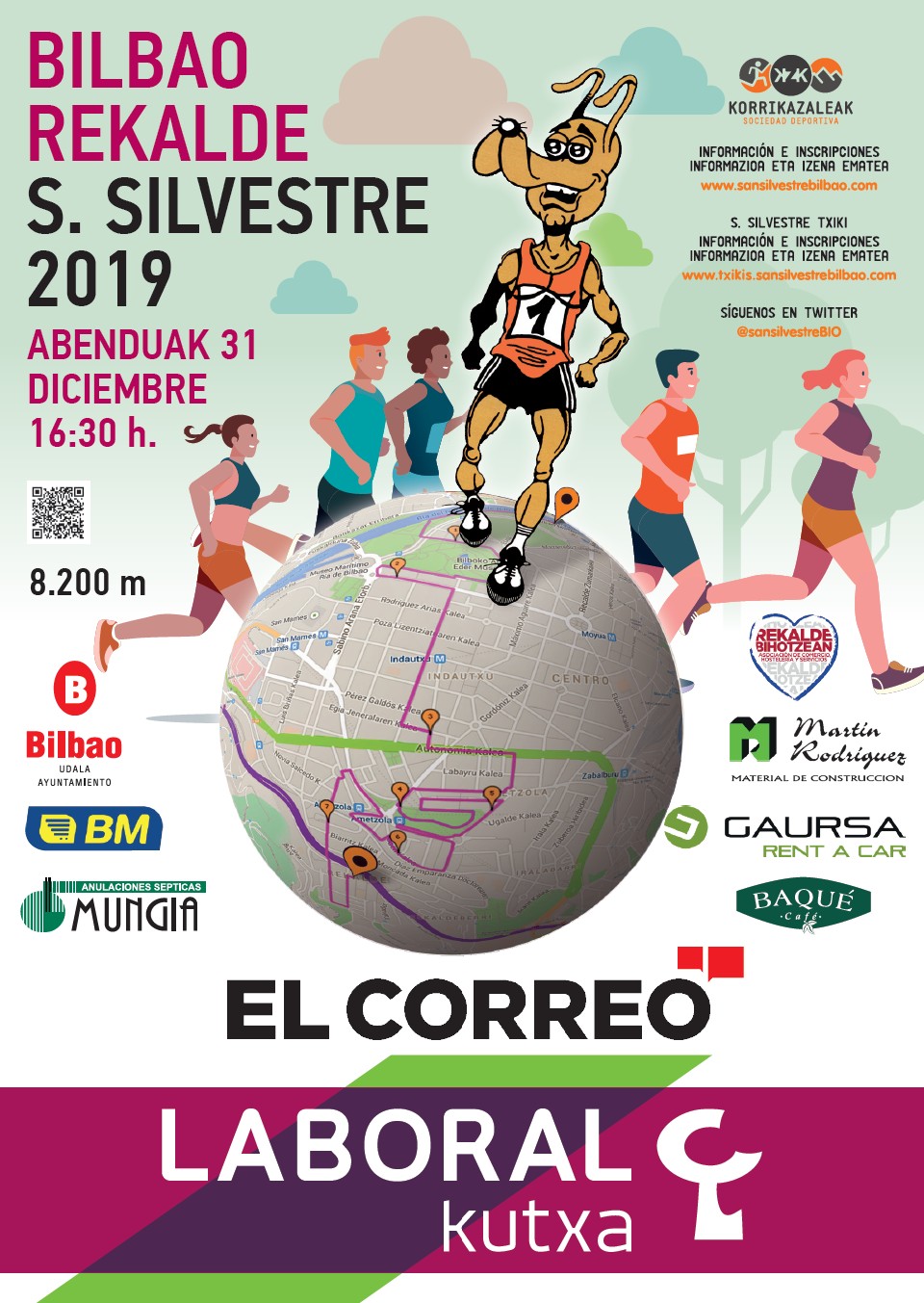 Nuevo recorrido. Presentamos un recorrido urbano de 8.200 metros que recorrerá céntricas calles de Bilbao con salida en el Museo Guggenheim y llegada en la plaza de Rekalde, barrio al que pertenece la S.D.Korrikazaleak. Contamos con un vídeo del recorrido publicado en www.recorrido.sansilvestrebilbao.com. Comienza en la explanada del Museo Guggenheim, por el paseo de la ría y cruzando el parque de Doña Casilda, hasta la plaza del Sagrado Corazón. Pasa por la Gran vía y sube por Dr. Areilza, girando por Autonomía hasta Enrique Eguren, y regresa por General Salazar hasta el parque de Amezola. Sube por el bidegorri y carretera hasta la estación de Ametzola y regresa girando por el bidegorri hasta la calle Jaén, continuando por el bidegorri por detrás del IES Eskurtze. Regresa por el paseo peatonal hasta la calle Villabaso, continua hasta León de Uruñuela y gira en Gordoniz hasta la meta en la Plaza de Rekalde.