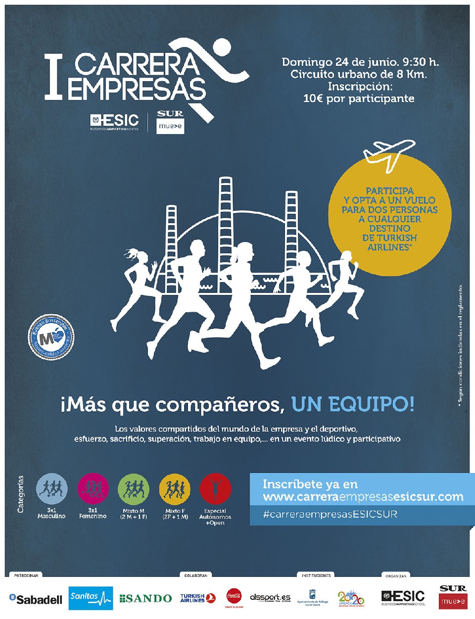 I CARRERA DE EMPRESAS ESIC SUR, que se celebrará con salida y meta en el Estadio de Atletismo ciudad de Málaga, pudiendo participar todo aquel que tenga cumplidos 18 años en dicha fecha, sin distinción de condición, sexo o nacionalidad.