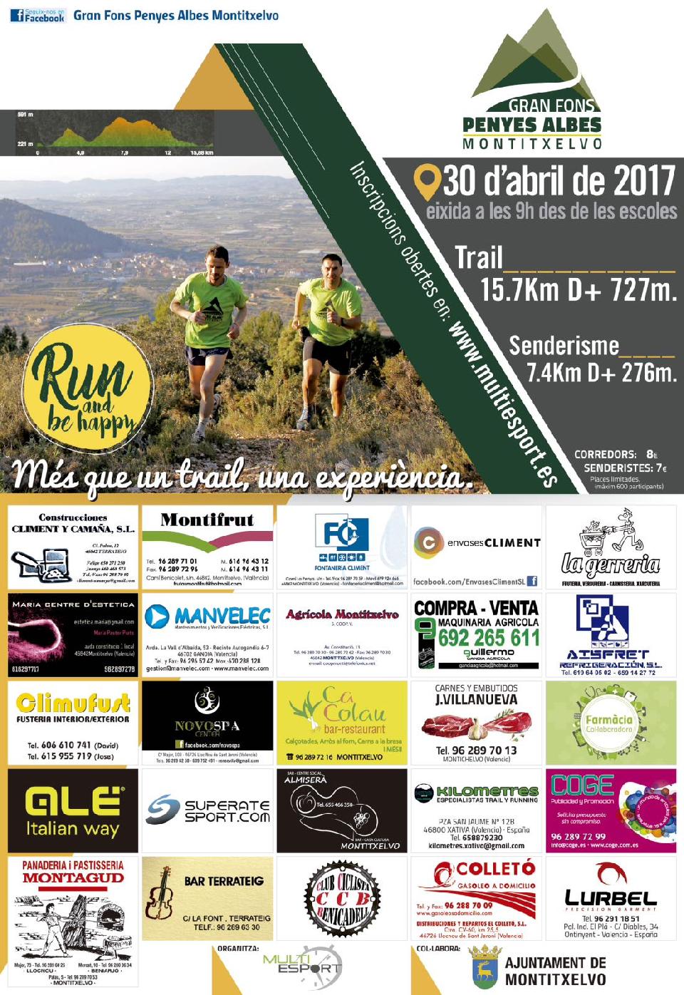 El II Gran Fons de les Penyes Albes de Montitxelvo estarà organitzat per l’empresa Multiesport. La prova es celebrarà el diumenge 30 d’abril del 2017, i l’eixida de la cursa de muntanya (modalitat A) serà a les 9:00h, mentre que l’eixida de la ruta senderista serà a les 9:10h (10 minuts més tard).