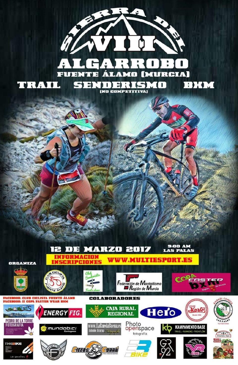 01. Los Clubes, Ciclista Fuente Álamo y el Club Senderista Fuente Alamo, en colaboración con el Ayuntamiento de Fuente Álamo, organizan el “VIII Trail-BXM Sierra del Algarrobo. Las pruebas que se van a disputar: