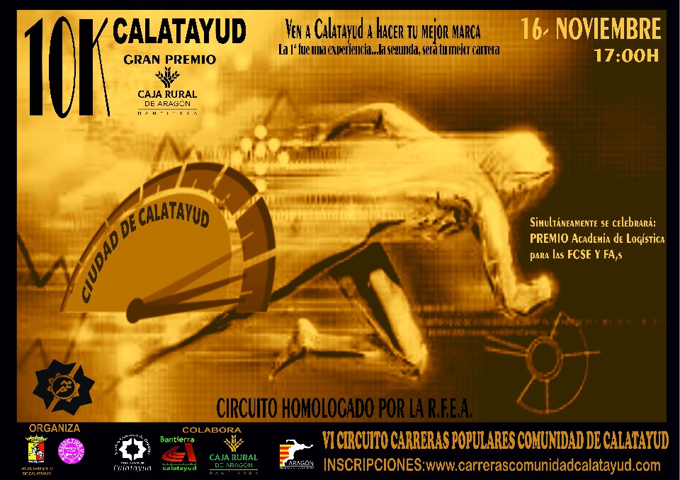 Artículo 1.- Organización y colaboradores. El Excmo. Ayuntamiento de Calatayud, Bantierra Atletismo Calatayud y Publiactiva VyP Crono y Eventos, con la colaboración de la Comarca Comunidad de Calatayud, de la Academia de Logística del Ejército de Tierra y de la Federación Aragonesa de Atletismo, organizan el “10K Ciudad de Calatayud - Gran Premio Caja Rural de Aragón” que se celebrará el sábado 16 de noviembre de 2019 a las 17 h en Calatayud (Zaragoza).