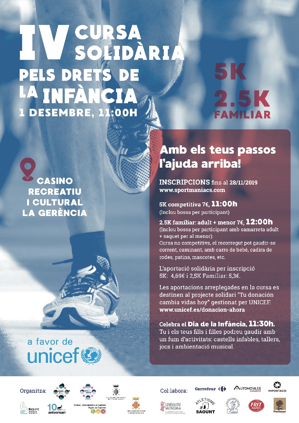 Artículo 6º. El dinero recaudado en la inscripción de la 5k se destinará 4.69 € a UNICEF, el resto del dinero se destina a los gastos de gestión, seguro de asistencia y chip. De los 7€ de la inscripción en la carrera 2.5K familiar se destinan 5.3 € a UNICEF, el resto se destina al seguro y gastos de gestión.