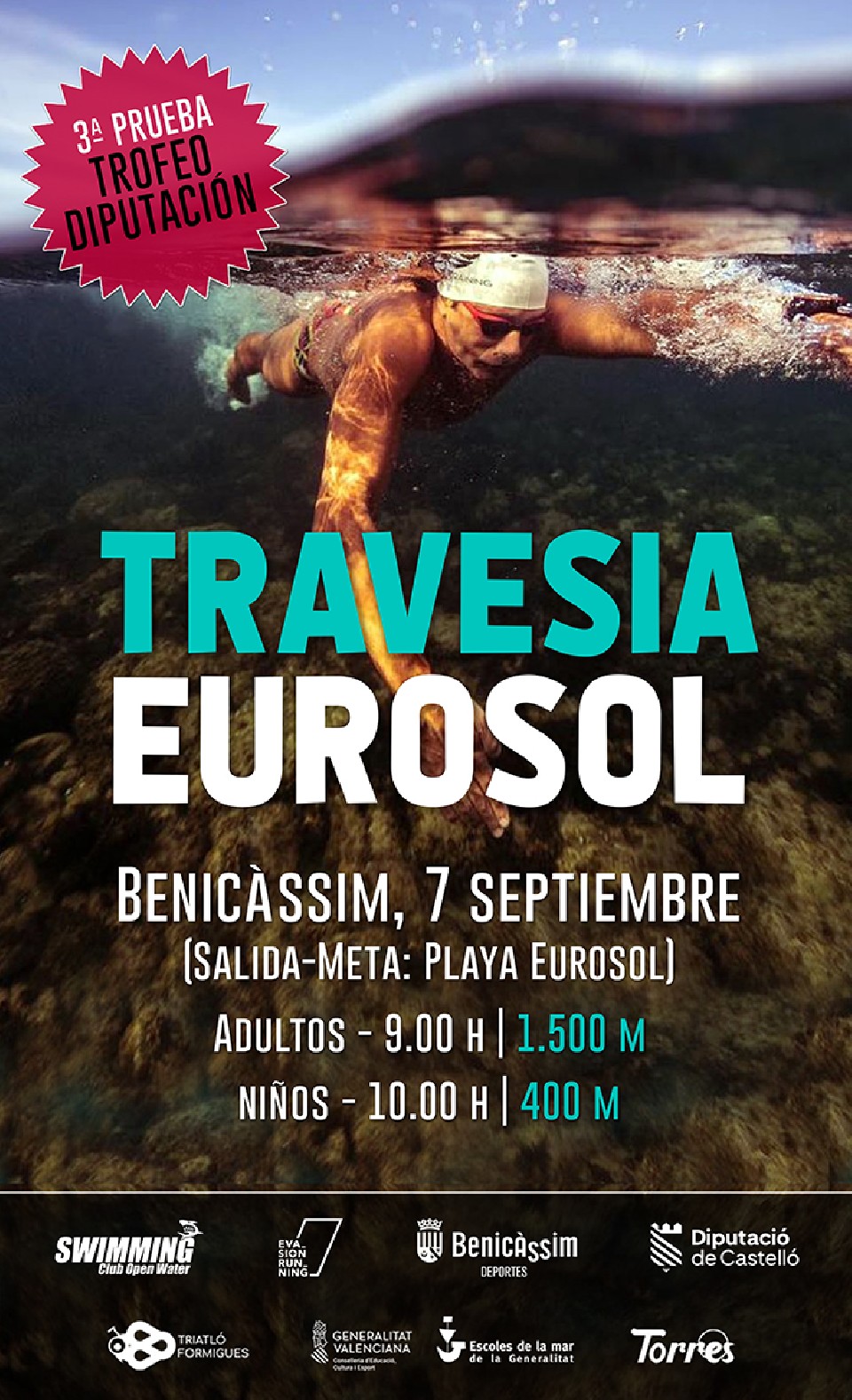 Distancia limitada a mayores de 15 años, nadadores nacidos en 2010 o superior, en caso de ser menores de 14 años presentar autorización subida en www.evasionrunning.es por parte del padre, madre o tutor legal y envío al mail info@evasionrunning.es