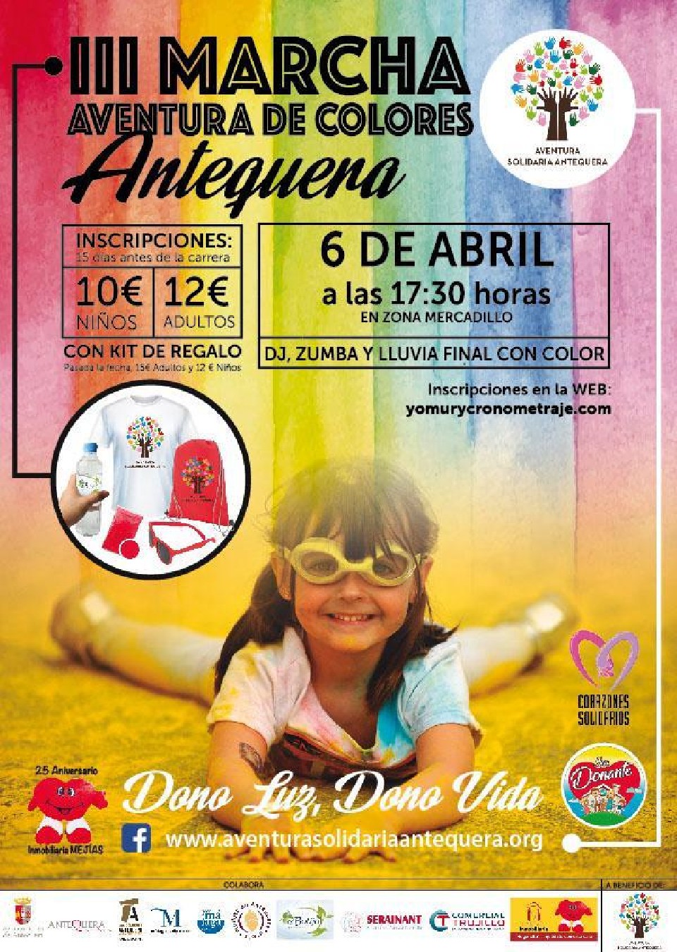 La III Aventura de Colores Antequera es una actividad solidaria, festiva, deportiva y familiar, donde el color y las ganas de pasarlo bien se unen para realizar un recorrido por las calles de Antequera.
