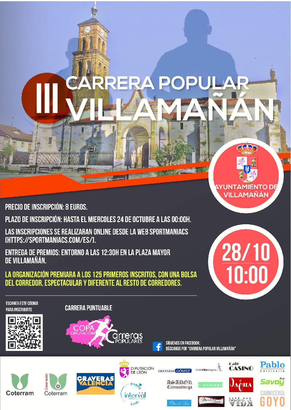 - Evento: III Carrera Popular de Villamañan. Día: Domingo 28 de Octubre de 2018. Hora: 10:00 horas de la mañana. Lugar: La salida y meta estarán situadas en la plaza mayor de Villamañan.