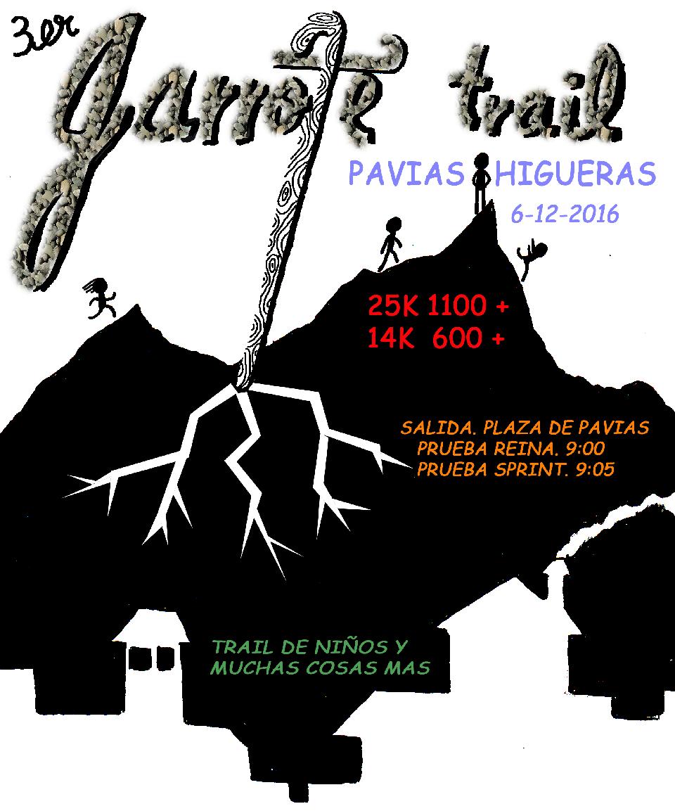 * Por tercer año consecutivo las localidades de Higueras y Pavías organizan TRAIL HIGUERAS-PAVIAS. En esta ocasión y de esta edición en adelante la prueba pasará a denominarse GARROTE TRAIL. Se trata de evento deportivo que consta de dos carreras de montaña de diferente kilometraje, una de 25 Km denominada TRAIL LARGO 25K con un desnivel de 1029 m. positivos y otros tanto de negativos y otra de 13.8 Km denominada SPRINT 14K, ambas DOS son COMPETITIVAS, se establece un tiempo máximo de 5 horas hasta el cierre de META. La celebración tendrá lugar el día 6 de diciembre a las 09,00 h en la localidad Pavias y tanto la salida como la llegada tendrán lugar en esta localidad.