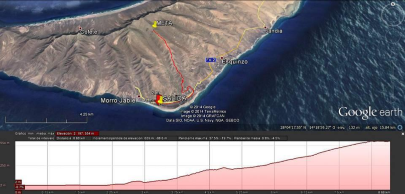 - -El sábado 4 de mayo con una distancia de 8,5 km nos encontramos con una cronoescalada que nos lleva desde la avenida del Saladar al pico mas alto de Fuerteventura, llegando de 5 metros a 550 metros de altitud y con una rampas superiores en algunos casos al 20%. -El Domingo 5 de mayo tendrá lugar el Rally de Jandia con una distancia de 42 km . Primero nos veremos en la Plaza de Los Pescadores de Morro Jable , desde donde saldremos neutralizados para finalmente tomar la salida oficial en la carretera que va desde Morro Jable a Punta de Jandia.