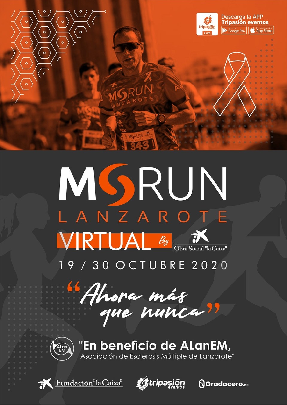 - Al ser este año la carrera virtual y mediante la APP de Tripasion Eventos, la SALIDA empieza el lunes 19 de octubre a las 08:00 de la mañana (hora Canaria), el recorrido debes elegir donde mejor te convenga y en cualquier zona del mundo y así poder colaborar con la Asociación Lanzaroteña para las Personas con Esclerosis Múltiple (ALanEM).