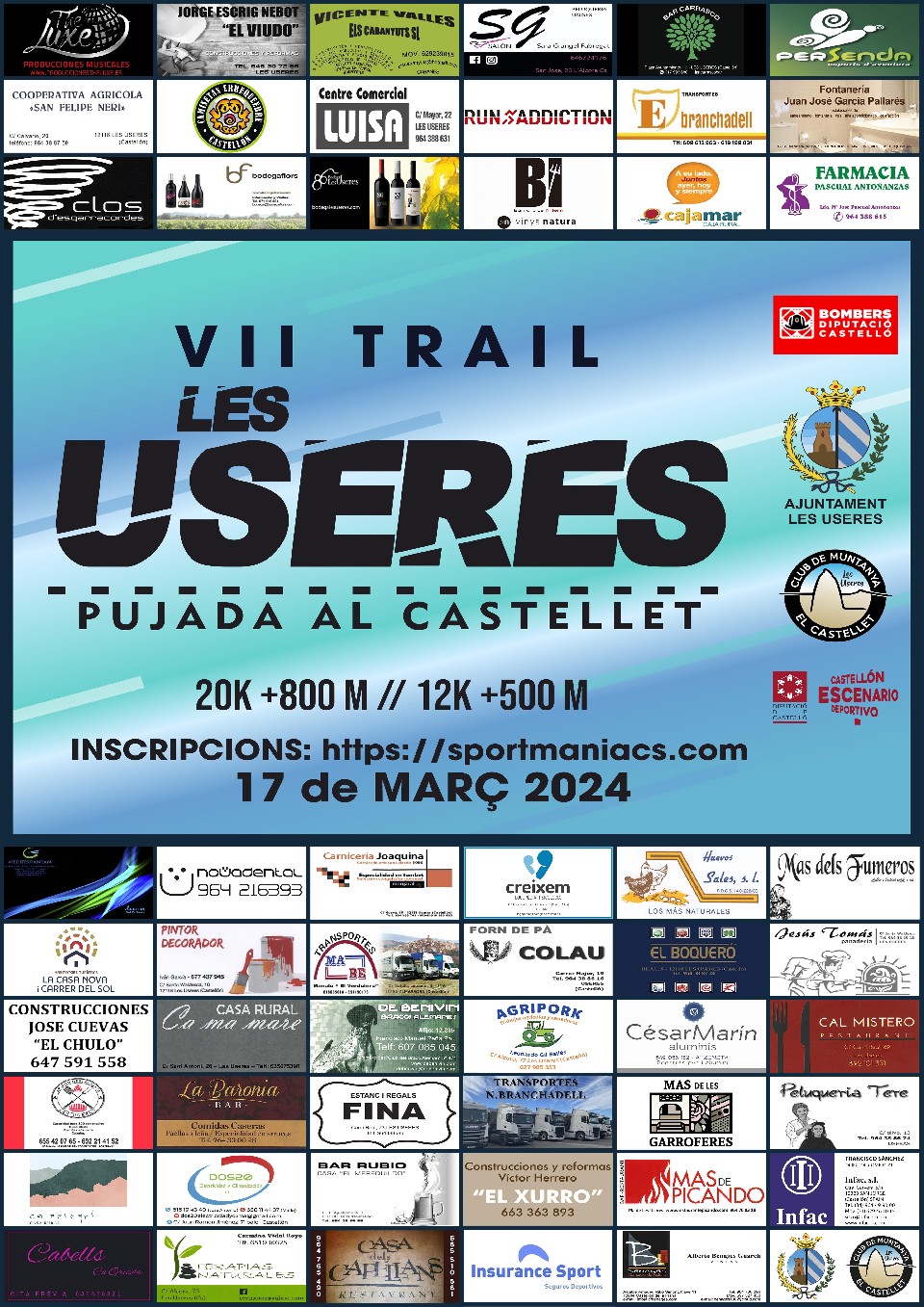 1. PRESENTACIÓ. El VII TRAIL LES USERES PUJADA AL CASTELLET es celebrarà el proper dia 17 de març de 2024 i està organitzat pel club de muntanya el Castellet i l’Ajuntament de les Useres. L’ eixida serà a les 08:30 hores la distància llarga i a les 08:45 hores la distància curta, des de la plaça de l’Ajuntament i tindrà un temps màxim de 4 hores i 30 minuts. L'arribada serà al mateix lloc que l'eixida. 2. RECORREGUT. Compta amb dos recorreguts: un de 20Km i un desnivell de 800 m positius i un altre de 12 Km i 500 m de desnivell positiu. Els recorreguts estaran marcats per senyals de cinta d’abalisar, marques de calç i altres elements indicatius. Els seus trajectes discorren per pistes i senders de muntanya que estan obertes al tràfic de vehicles. Durant els recorreguts hauran avituallaments distribuïts en el quilometratge següent: Avt Quilòmetre Avt 1 Km – 5 Líquid i sòlid Avt 2 Km - 10 Líquid i sòlid Avt 3 Km - 14 Líquid i sòlid Avt 4 Km - 17 Líquid Avt 5 FINAL ATENCIÓ. Per tal de assegurar que els participants entren en meta a temps, en la distància llarga, s’establiran dos punts de tall: TALL Quilòmetre TEMPS Punt 1 Km – 10 2h 15’ Punt 2 Km – 14 3h 15’ MATERIAL OBLIGATORI: Gots o recipient ( No hi haurà gots en els avituallaments) 3. INSCRIPCIONS. L’edat per poder inscriure’s serà de 18 anys. En la distància curta l’edat mínima serà de 14 anys. Els anys seran complits durant l’any 2024. Per a replegar el dorsal d'un menor, es deu aportar l'autorització del TUTOR LEGAL del menor, que es podrà descarregar des de la pagina web https://www.runaddiction.es. El butlletí d’inscripció dels menors haurà d’estar signat i conformat pel responsable del menor. L’import de la inscripció per a qualsevol de les proves serà segons el període d’inscripció i es detalla en el següent quadre: Del 23/12/23 a 07/01/24 Del 08/01/2024 a 18/02/2024 Del 19/02/2024 a 11/03/2024 16 € 18 € 20€ *EL PREU PER ALS MEMBRES DEL CLUB EL CASTELLET DE LES USERES SERÀ DE 15 EUROS EN TOT EL TERMINI DE LA INSCRIPCIÓ. El termini de l’ inscripció es tancarà el dimarts dia 12 de març a les 23:59 h. A partir d'aquesta data no s'admetrà cap inscripció més. El límit de participants serà de 150 dorsals per a la cursa curta y 300 por a la llarga. EL DIA DE LA PROVA NO S’ ADMETRAN INSCRIPCIONS. En cas de creure oportú l'organització es reserva el dret d'anticipar el final del termini d'inscripció. 4. DORSALS. El lliurament de dorsals es farà a Plaça de l’Ajuntament, el dia 16 de març a partir de les 18:00h fins les 19:30h, i el mateix dia de la prova a partir de les 07:00 hores fins a 15 minuts abans de l’hora de la sortida. El control de META es tancarà a la 13.00 h. A l'hora de retirar el dorsal, cada participant deu mostrar el seu D.N.I. Per a replegar el dorsal d'una altra persona, serà necessari una autorització amb fotocopia del DNI firmada pel titular del dorsal. Tots els menors deuran portar l’autorització del tutor legal, per poder recollir el dorsal. Si no se entrega la esmentada autorització NO SE LI ENTREGARÀ el dorsal. 5. PAGAMENT INSCRIPCIÓ. El pagament de l’ inscripció dona dret a: 1- Tenir accés als avituallaments establerts en el recorregut de la prova. 2- Tenir accés al control d’avituallament al finalitzar la prova. 3- Assistència sanitària, tant en el transcurs de la prova com a l´arribada. 4- Servei de dutxes. 5- Borsa del corredor amb els regals recollits per l’organització. Serà motiu de desqualificació i pèrdua de tots els drets que dona l’ inscripció: A- Ser irrespectuós amb altres companys de prova així com també amb la natura. B- Embrutar, maltractar o degradar l’entorn. C- No passar pels controls establerts per l’organització. D- No realitzar el recorregut per les zones marcades per l’organització. E- No dur el dorsal de forma ben visible en la part davantera del participant. 6. PREMIS. La entrega de trofeus es realitzarà a les 12:00 h, en cas de faltar un participant per completar el pòdium d’una categoria, es posposarà fins completar el pòdium. El dia de la prova es podrà canviar de distància, però, aleshores no es tindrà dret a pòdium. • La distància de 12 km serà competitiva i tindrà trofeu per als tres primers absoluts masculins i femenins i al primer masculí i femení local. • En la distància de 20 km s’ entregaran trofeus als 3 primers classificats en cada categoria tant en hòmens com en dones, tenint en compte l’edat del dia de la cursa. Les categories es regeixen des de l’any que es compleix l’edat que defineix cada categoria: • Sènior - fins els 39 anys. • Veterans/nes A - dels 40 a 49 anys. • Veterans/nes B - dels 50 a 59 anys. • Màster – a partir de 60 anys. • Locals - Participants empadronats en la localitat de qualsevol edat. Es premiarà: • GUANYADOR I GUANYADORA absoluts de la prova. • Participant masculí o femení mes veterà de la prova. • Als clubs/equips amb un mínim de 10 participants que estiguen inscrits amb el mateix nom rebran una espaleta. 7. METEOROLOGIA. El mal temps no serà motiu de suspendre la prova, encara que, l'organització se reserve el dret a suspendre-la o modificar el recorregut. En cas que les autoritats suspenguen la prova per motius de climatologia extrema, risc de alerta d'incendi o risc de posar en risc la integritat dels participants, l'organització no es farà càrrec de la devolució de l'import de les inscripcions, però si de repartir el material adquirit a la borsa del corredor. 8. MOLT IMPORTANT. • La prova compta amb una assegurança de responsabilitat civil i d'accident per als participants que no estiguen federats per a carreres en muntanya. Davant de qualsevol problema o accident els participants tenen la obligació d'avisar a la organització a través dels/les voluntaris/es perquè es puga procedir a gestionar la incidència de la millor manera possible.