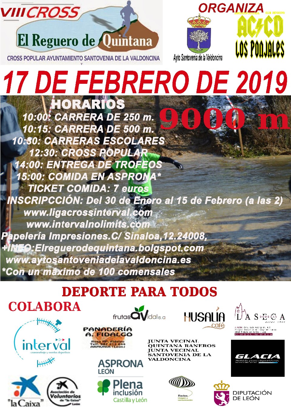 - Evento: VIII Cross Popular "El Reguero De Quintana" Fecha: 17 de Febrero de 2019. Lugar: Campo de Fútbol de Quintana de Raneros. Hora: 12:30
