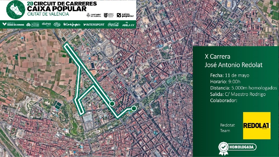 La Fundación Deportiva Municipal, con la colaboración de la Oficina Municipal de Atención a Personas con Discapacidad, organiza la 10ª Carrera José Antonio Redolat, quinta prueba puntuable del 20º Circuit de Carreres Caixa Popular Ciutat de València. Cuenta con el apoyo de Caixa Popular, Fundación Trinidad Alfonso, Intersport, Cárnicas Serrano, Coca-Cola, El Corte Inglés y Divina Seguros.