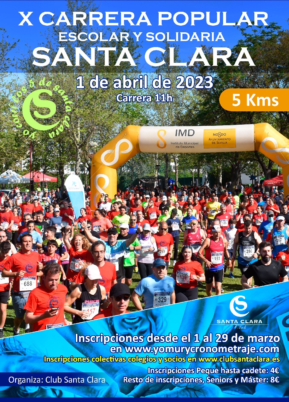 2.- Las inscripciones podrán realizarse desde el 1 hasta el 29 de marzo, vía web www.yomurycronometraje.com, con la única excepción de las inscripciones colectivas de los colegios y a los socios del Club Santa Clara, que podrán ser presenciales o en el enlace directo en la web del club www.clubsantaclara.es. Teléfono de información 954256479-954516476. El precio de la inscripción es 4 € para categorías peque, prebenjamín, benjamín, alevín, infantil y cadete, y de 8 € para sénior y máster.