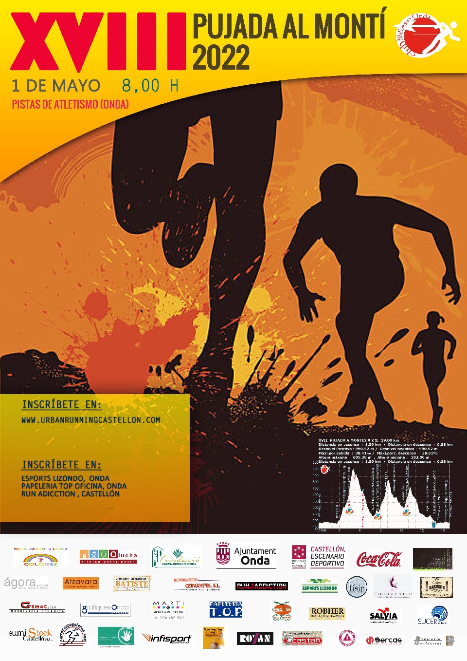 El Club Atletismo Onda organiza la XVIII PUJADA A MONTÍ, que se celebrará el domingo 1 de MAYO de 2022 a partir de la 08:00 horas. 1. La prueba es de carácter popular deportiva de fondo por montaña, que tiene como objetivo fomentar las pruebas de resistencia por montaña. El tiempo máximo de la prueba es de 04:30 horas. 2. Su recorrido será aproximadamente de 19.000 metros con un desnivel acumulado de 990.52 metros y transcurrirá en su mayor parte por un circuito de caminos y pistas forestales y el resto por trazado urbano. La salida y la meta estarán situadas en la Pista de Atletismo “L’OLIMPIC”. 3. Durante el recorrido habrá cuatro puestos de avituallamiento con agua e isotónico y dos de ellos con alimentos sólidos. 4. El cronometraje de la prueba será realizado por la empresa . 5. No podrá participar en dicha prueba menor de 18 años. Las categorías serán las siguientes: CATEGORÍAS: Junior / Promesas (18 a 23 años) Senior mas/fem. (24 a 39) años Veteranos / as A. (40 a 49 años) Veteranos / as B. (50 a 59 años) Veteranos/ as C. (60 años en adelante) CATEGORIA LOCAL mas/fem. 6. Se descalificará a cualquier corredor que: ensucie el entorno, incumpla el recorrido y no lleve el dorsal en lugar visible, y falsee dorsal asignado con otra identidad, (la organización establecerá puntos de control a lo largo del circuito). 7. Trofeos, obsequios y premios: Se entregará trofeo a los tres primeros Absolutos y a los tres primeros clasificados de cada categoría masculino y femenino. Los premiados con trofeos son acumulables.
