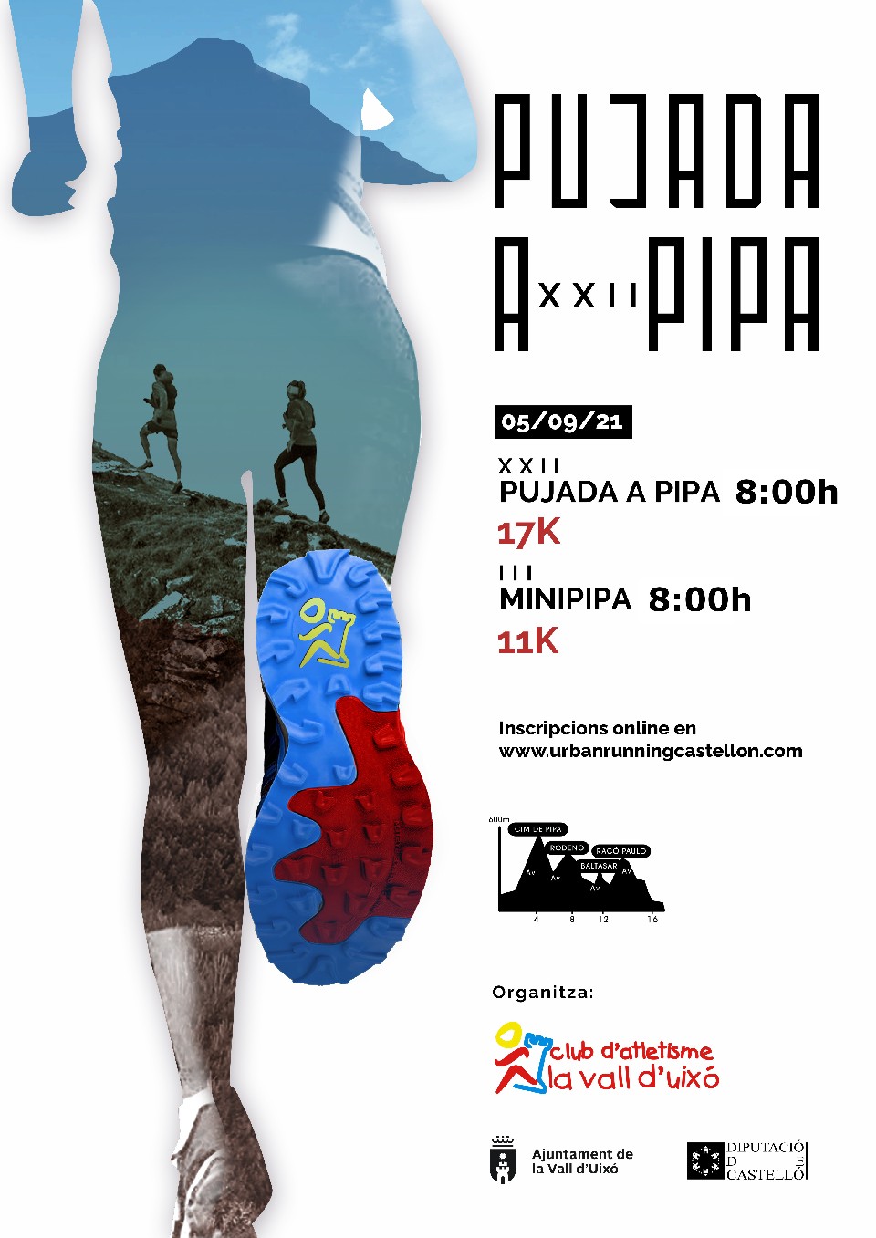 L’eixida serà des de la Pista d’atletisme Vicente Arzo de la Vall d’Uixó a les 8.00 hores per PUJADA A PIPA i MINIPIPA el dia 5 de setembre. L’arribada estarà ubicada també en la Pista d’Atletisme de la Vall d’Uixó i podran fer el recorregut en un temps màxim de 4’15 hores (es tancarà control d’arribada a es 12’15 hores). També es tancarà el control de PAS INTERMIG en el Coll de Garrut a les 10.00 hores.