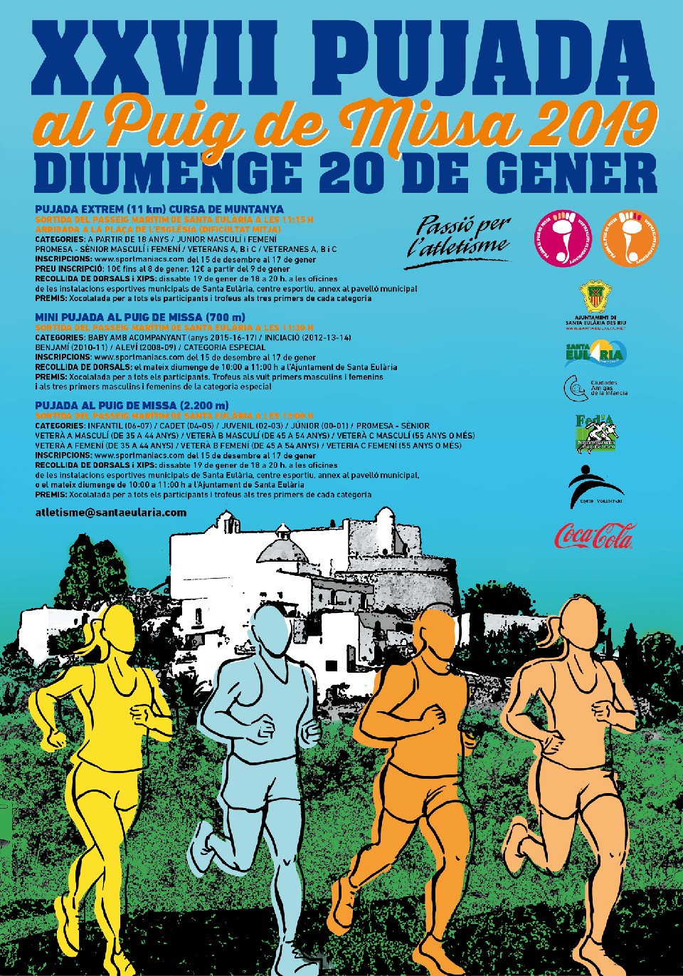 El Ayuntamiento de Santa Eulària organiza la XVII MINI PUJADA AL PUIG DE MISSA 2019, carrera de promoción sobre asfalto de 700m a la que tendrán acceso todas las personas de las categorías baby, iniciación, benjamín , alevín y categoría especial con o sin licencia federativa. La prueba se disputara el domingo 20 de enero de 2019. Esta prueba efectuará su salida a las 11:30h en el paseo marítimo de Santa Eulalia y la llegada en la desembocadura del Río de Santa Eulària.
