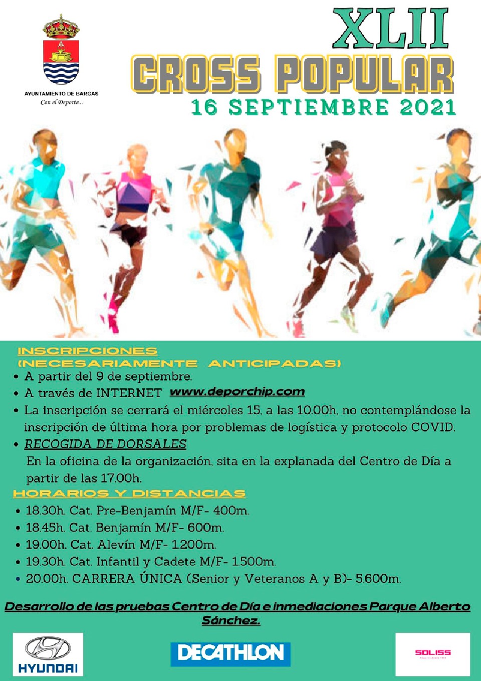 Sailkapenak ALEVINES 1.2km Sailkapenak ikusi INFANTILESYCADETES 1.5km Sailkapenak ikusi BENJAMINES 0.6km Sailkapenak ikusi PREBENJAMINES 0.4km Sailkapenak ikusi GENERAL 5.6km Sailkapenak ikusi Kontaktuaren informazioa Antolatzailearekin harremanetan jarri – Araudia https://www.deporchip.com/eventos/pruebas2021/bargas21/reglamento.pdf