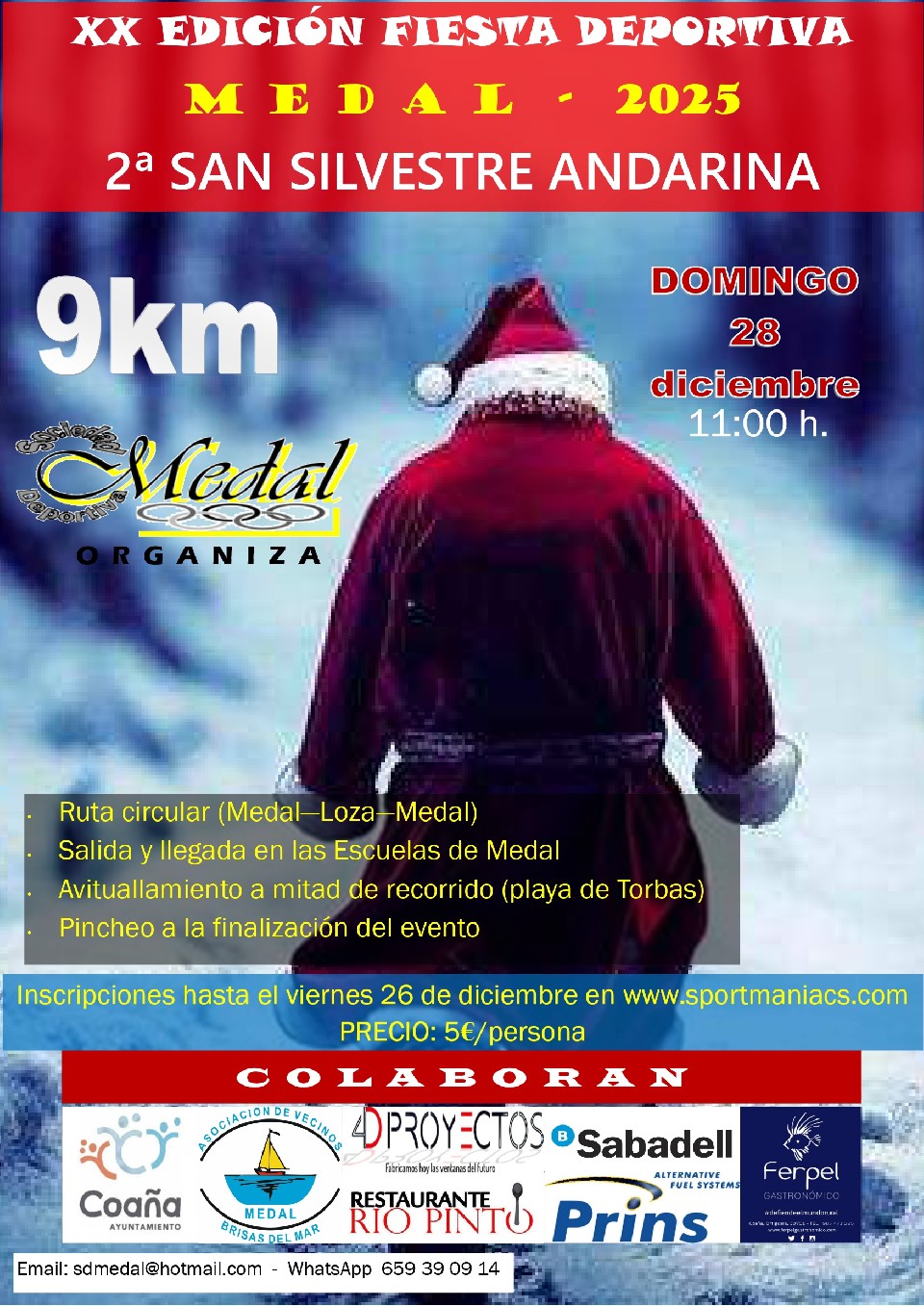 La Sociedad Deportiva de Medal, organiza el próximo 28 de diciembre de 2025, la 2ª San Silvestre Andarina, una caminata a pie de 9km, con salida y llegada en las Escuelas de Medal. La caminata tendrá el mismo recorrido que la del año 2024, recorriendo las localidades de Medal – Loza, Lugar Nuevo y El Esteler, pasando por las playas de A Figueria y Torbas.
