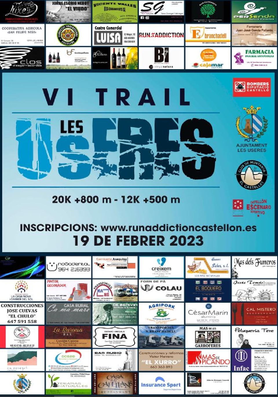 REGLAMENT 1. PRESENTACIÓ. El VI TRAIL LES USERES PUJADA AL CASTELLET es celebrarà el proper dia 19 de febrer de 2023 i està organitzat pel club de muntanya el Castellet i l’Ajuntament de les Useres. L’ eixida serà des de la plaça de l’Ajuntament a les 08:30 hores la distància llarga i a les 09:00 hores la distància curta, i tindrà un temps màxim de 4 hores i 30 minuts. L'arribada serà al mateix lloc que l'eixida. 2. RECORREGUT. Compta amb dos recorreguts: un de 20Km i un desnivell de 800 m positius i un altre de 12 Km i 500 m de desnivell positiu. Els recorreguts estaran marcats per senyals de cinta d’abalisar, marques de calç i altres elements indicatius. Els seus trajectes discorren per pistes i senders de muntanya que estan obertes al tràfic de vehicles. Durant els recorreguts hauran avituallaments distribuïts en el quilometratge següent: Avt Quilòmetre Avt 1 Km – 5 Líquid i sòlid Avt 2 Km - 10 Líquid i sòlid Avt 3 Km - 14 Líquid i sòlid Avt 4 Km - 17 Líquid Avt 5 FINAL ATENCIÓ. Per tal de assegurar que els participants entren en meta a temps, en la distància llarga, s’establiran dos punts de tall: TALL Quilòmetre TEMPS Punt 1 Km – 10 2h 15’ Punt 2 Km – 14 3h 15’ MATERIAL OBLIGATORI: Gots o recipient ( No hi haurà gots en els avituallaments) 3. INSCRIPCIONS. L’edat per poder inscriure’s serà de 18 anys. En la distància curta l’edat mínima serà̀ de 14 anys. Els anys seran complits durant l’any 2023. Per a replegar el dorsal d'un menor, es deu aportar l'autorització del TUTOR LEGAL del menor, que es podrà̀ descarregar des de la pagina web https://www.runaddiction.es. El butlletí́ d’inscripció́ dels menors haurà̀ d’estar signat i conformat pel responsable del menor. L’import de la inscripció per a qualsevol de les proves serà segons el període d’inscripció i es detalla en el següent quadre: Del 17/12/22 a 31/01/23 Del 01/02/2023 a 14/02/2023 16 € 18 € *EL PREU PER ALS MEMBRES DEL CLUB EL CASTELLET DE LES USERES SERÀ DE 13 EUROS EN TOT EL TERMINI DE LA INSCRIPCIÓ. El termini de l’ inscripció es tancarà el dimarts dia 14 de febrer a les 23:59 h. A partir d'aquesta data no s'admetrà cap inscripció més. El límit de participants serà de 150 dorsals per a la cursa curta y 300 por a la llarga. EL DIA DE LA PROVA NO S’ ADMETRAN INSCRIPCIONS. En cas de creure oportú l'organització es reserva el dret d'anticipar el final del termini d'inscripció. 4. DORSALS. El lliurament de dorsals es farà a Plaça de l’Ajuntament, el dia 18 de febrer a partir de les 18:00h fins les 19:30h, i el mateix dia de la prova a partir de les 07:30 hores fins a 15 min abans de l’hora de la sortida. El control de META es tancarà a la 13.00 h. A l'hora de retirar el dorsal, cada participant deu mostrar el seu D.N.I. Per a replegar el dorsal d'una altra persona, serà necessari una autorització amb fotocopia del DNI firmada pel titular del dorsal. Tots els menors deuran portar l’autorització del tutor legal, per poder recollir el dorsal. Si no se entrega la esmentada autorització NO SE LI ENTREGARÀ el dorsal. 5. PAGAMENT INSCRIPCIÓ. El pagament de l’ inscripció dona dret a: 1- Tenir accés als avituallaments establerts en el recorregut de la prova. 2- Tenir accés al control d’avituallament al finalitzar la prova. 3- Assistència sanitària, tant en el transcurs de la prova com a l´arribada. 4- Servei de dutxes. 5- Borsa del corredor amb els regals recollits per l’organització. Serà motiu de desqualificació i pèrdua de tots els drets que dona l’ inscripció: A- Ser irrespectuós amb altres companys de prova així com també amb la natura. B- Embrutar, maltractar o degradar l’entorn. C- No passar pels controls establerts per l’organització. D- No realitzar el recorregut per les zones marcades per l’organització. E- No dur el dorsal de forma ben visible en la part davantera del participant. 6. PREMIS. La entrega de trofeus es realitzarà a les 12:00 h, en cas de faltar un participant per completar el pòdium d’una categoria, es posposarà fins completar el pòdium. El dia de la prova es podrà canviar de distància, però, aleshores no es tindrà dret a pòdium. • La distància de 12 km serà competitiva i tindrà trofeu per als tres primers absoluts masculins i femenins i al primer masculí i femení local. • En la distància de 20 km s’entregaran trofeus als 3 primers classificats en cada categoria tant en hòmens com en dones, tenint en compte l’edat del dia de la cursa. Les categories seran: • Sènior - fins els 39 anys. • Veterans/nes A - dels 40 a 49 anys. • Veterans/nes B - dels 50 a 59 anys. • Màster – a partir de 60 anys. • Locals - Participants empadronats en la localitat de qualsevol edat. Es premiarà: • GUANYADOR I GUANYADORA absoluts de la prova dels 20 km.. • Als clubs/equips amb més de 10 participants se'ls premiarà amb una espaleta (una volta inscrit NO s’admetrà̀ cap canvi d’equip). 7. METEOROLOGIA. El mal temps no serà motiu de suspendre la prova, encara que, l'organització se reserve el dret a suspendre-la o modificar el recorregut. En cas que les autoritats decidisquen suspendre la prova per motius de climatologia extrema, risc de alerta d'incendi o risc de posar en risc la integritat dels participants, l'organització no es farà càrrec de la devolució de l'import de les inscripcions, però si de repartir el material adquirit a la borsa del corredor. 8. MOLT IMPORTANT. • La prova compta amb una assegurança de responsabilitat civil i d'accident per als participants que no estiguen federats per a carreres en muntanya. Davant de qualsevol problema o accident els participants tenen la obligació d'avisar a la organització a través dels/les voluntaris/es perquè es puga procedir a gestionar la incidència de la millor manera possible. • És obligatori en cas d’abandonament avisar al control d’avituallament mes pròxim o al cont