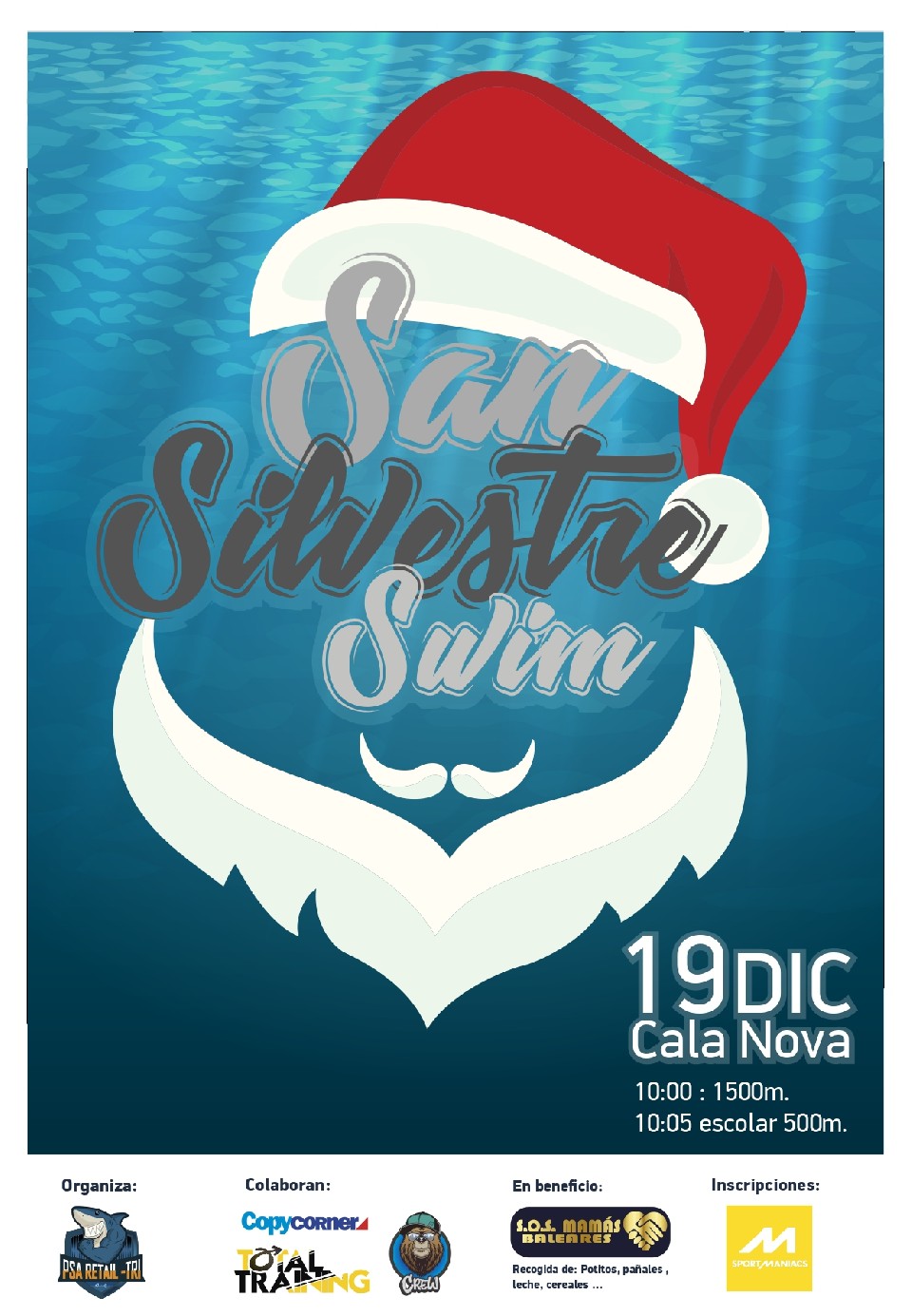- SAN SILVESTRE SWIM Día: 19 de diciembre de 2021 Lugar: Playa Cala Nova Hora: 09.15 hrs. Recogida de dorsales 09:45 hrs. Fin de entrega de dorsales 10.00 hrs. Salida categoría absoluta 10.05 hrs. Salida categoría infantil 11.30 hrs. Entrega de trofeos Distancia: 1500 metros absolutos y 500 metros infantiles. Inscripciones disponibles hasta el día 18 a las 23:59h