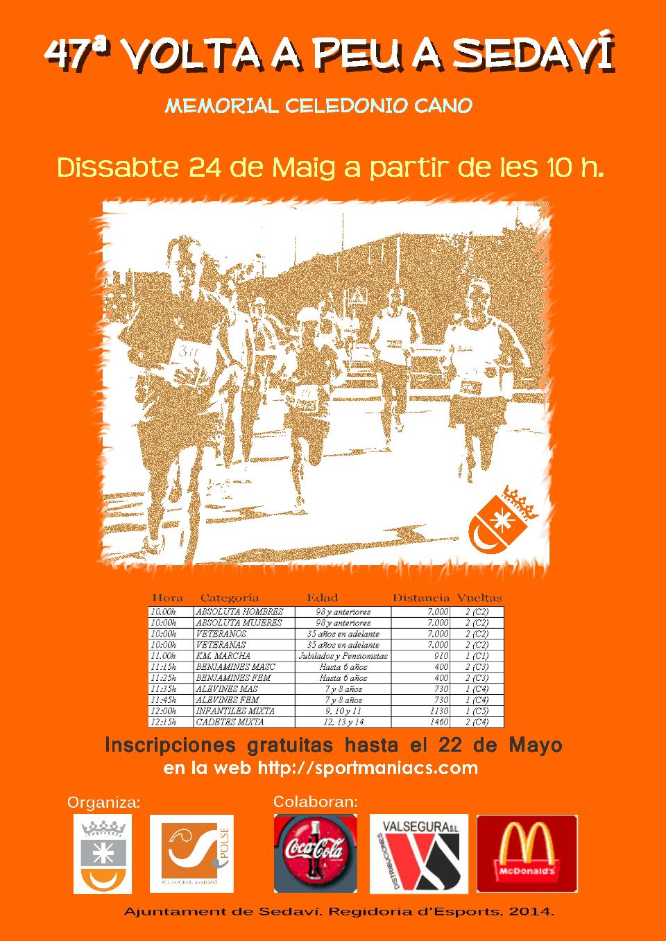El Ayuntamiento de Sedaví, a través de su Concejalía de Deportes, y el Club Atletisme Sedaví organizan, la 47ª VOLTA A PEU A SEDAVI, MEMORIAL CELEDONIO CANO que se celebrará el próximo 24 de Mayo