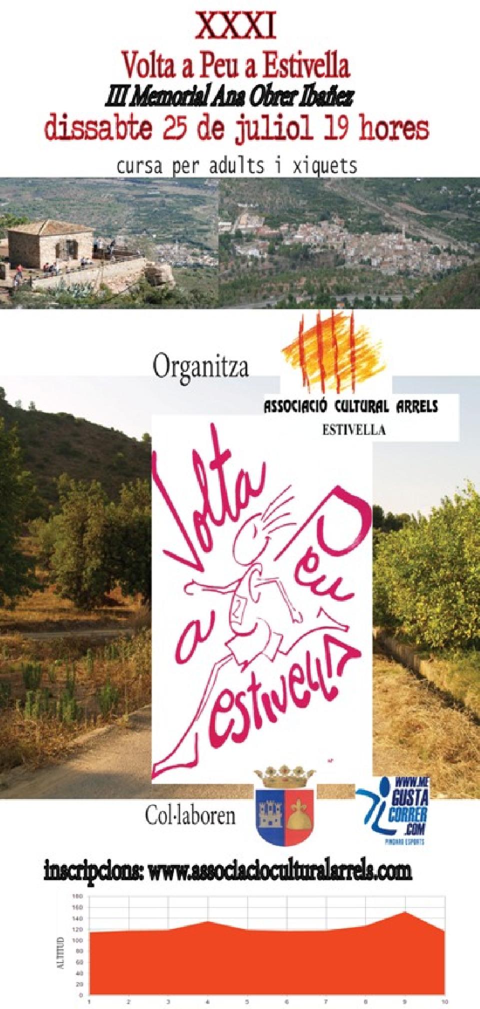 Art. 1- L'Associació Cultural Arrels, organitza la XXXI Volta a Peu a Estivella, sobre un recorregut de 10,170 Quilòmetres, on pot participar-hi qualsevol persona sense distinció de sexe, raça i nacionalitat. La cursa se celebrarà el proper 25 de juliol de 2015. La Volta començarà a les 19:45 hores.