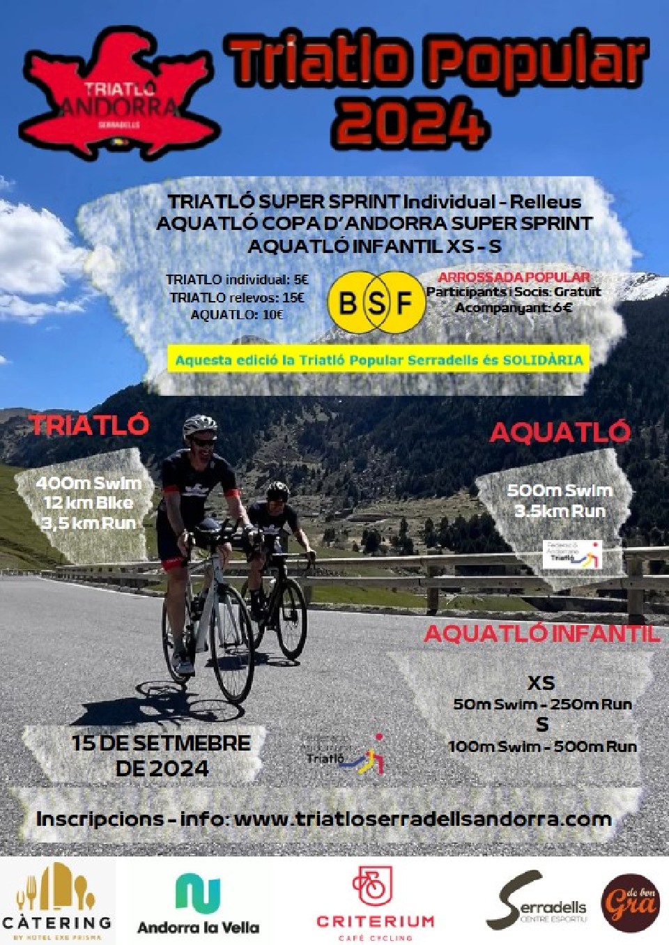 Classificações Dorsal 0 - dona a bicis sense fronteres -Km Pendente Triatló Popular Súper Sprint 15/09/2024 09:15 15.9Km Ver classificações Triatló Popular relleus Súper Sprint 15/09/2024 09:30 15.9Km Ver classificações Aquatló Copa Andorra Súper sprint 15/09/2024 11:30 4Km Ver classificações Aquatló infantil S - 9 a 13 anys 15/09/2024 13:00 0.6Km Ver classificações Aquatló infantil XS - fins els 8 anys 15/09/2024 13:00 0.3Km Ver classificações Informação de contacto Contactar com o organizador – Regulamento Reglament