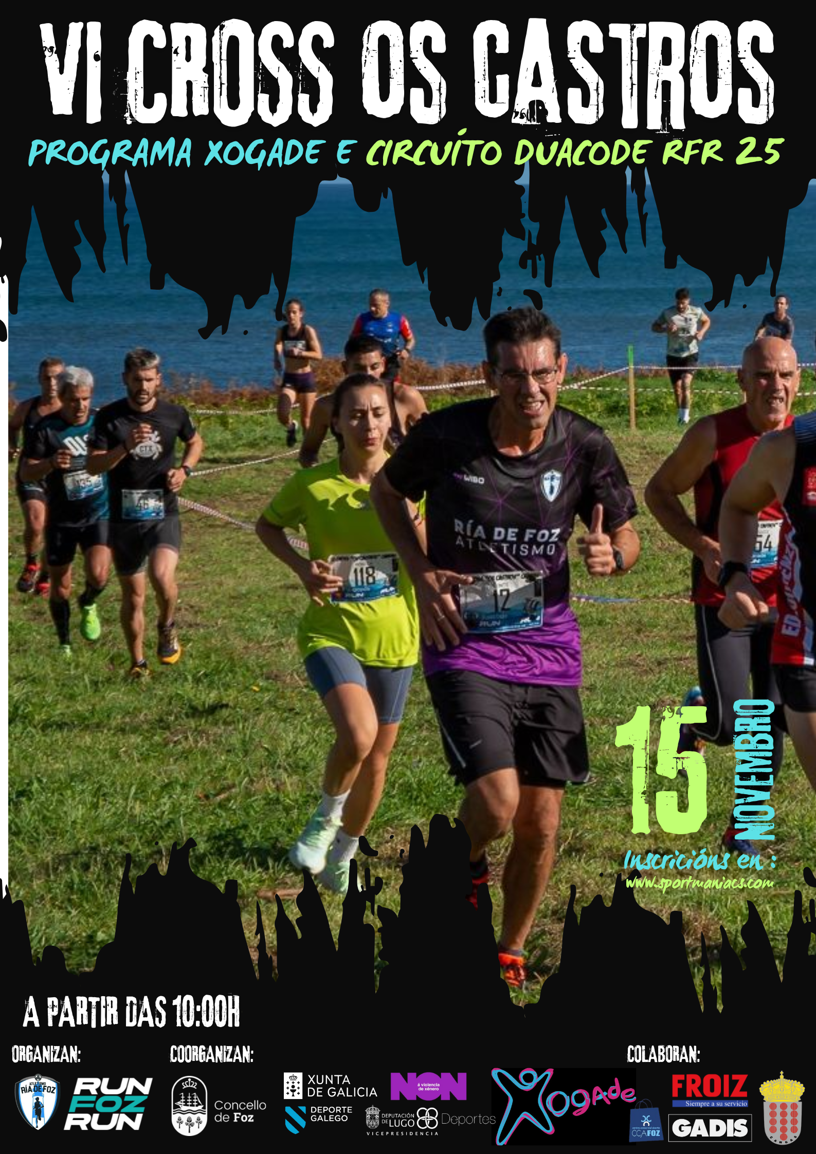 ART 1. La “VI Carreira Cross "Os Castros ” tendrá lugar el SÁBADO 15 DE NOVIEMBRE. A partir de las 10:00h de la mañana, sobre un circuito de 300 m para Pícaros, 600m Benjamines, 1000 m Alevines, 1600m Infantiles, 2000m Cadetes, 6km para la competición Absoluta. Con salida y meta en Campo de fútbol de Cangas, frente al CENTRO CÍVICO de Cangas de Foz.